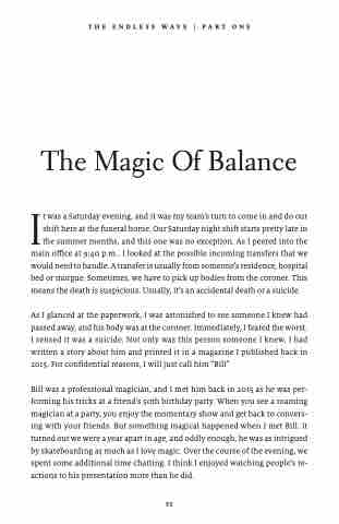 Bill was a professional magician, and I met him back in 2015 as he was per- forming his tricks at a friend’s 50th birthday party. When you see a roaming magician at a party, you enjoy the momentary show and get back to convers- ing with your friends. But something magical happened when I met Bill. It turned out we were a year apart in age, and oddly enough, he was as intrigued by skateboarding as much as I love magic. Over the course of the evening, we spent some additional time chatting. I think I enjoyed watching people’s re- actions to his presentation more than he did.
