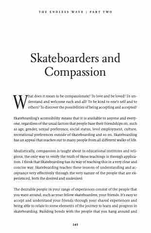 Idealistically, compassion is taught about in educational institutes and reli- gions, the only way to verify the truth of these teachings is through applica- tion. I think that Skateboarding has its way of teaching this in a very clear and concise way. Skateboarding teaches these lessons of understanding and ac- ceptance very effectively through the very nature of the people that are ex- perienced, both the desired and undesired.