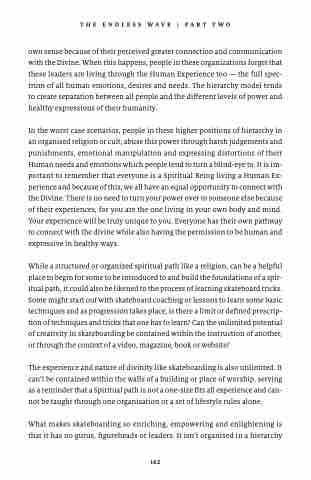 While a structured or organized spiritual path like a religion, can be a helpful place to begin for some to be introduced to and build the foundations of a spir- itual path, it could also be likened to the process of learning skateboard tricks. Some might start out with skateboard coaching or lessons to learn some basic techniques and as progression takes place, is there a limit or defined prescrip- tion of techniques and tricks that one has to learn? Can the unlimited potential of creativity in skateboarding be contained within the instruction of another, or through the context of a video, magazine, book or website?
