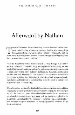The satisfaction and delight in writing The Endless Wave can be com- pared to the feeling of having a great day Skating where everything flowed, something new was learnt or a trick was filmed. The Endless Wave was a truly remarkable process and something that I never imagined doing as a skateboarder and an author.