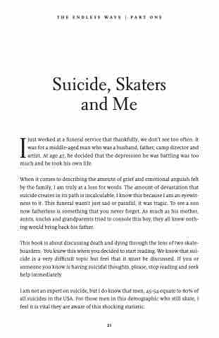 This book is about discussing death and dying through the lens of two skate- boarders. You knew this when you decided to start reading. We know that sui- cide is a very difficult topic but feel that it must be discussed. If you or someone you know is having suicidal thoughts, please, stop reading and seek help immediately.
