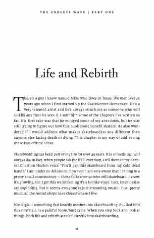 There’s a guy I know named Mike who lives in Texas. We met over 25 years ago when I first started up the SkateGeezer Homepage. He’s a very talented artist and he’s always struck me as someone who will call BS any time he sees it. I sent him some of the chapters I’ve written so far. His first take was that he enjoyed some of my anecdotes, but he was still trying to figure out how this book could benefit skaters. He also won- dered if I would address what makes skateboarders any different than anyone else facing death or dying. This chapter is my way of addressing these two critical ideas.