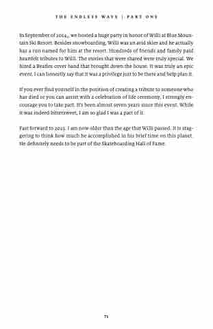 In September of 2014,, we hosted a huge party in honor of Willi at Blue Moun- tain Ski Resort. Besides snowboarding, Willi was an avid skier and he actually has a run named for him at the resort. Hundreds of friends and family paid heartfelt tributes to Willi. The stories that were shared were truly special. We hired a Beatles cover band that brought down the house. It was truly an epic event. I can honestly say that it was a privilege just to be there and help plan it.