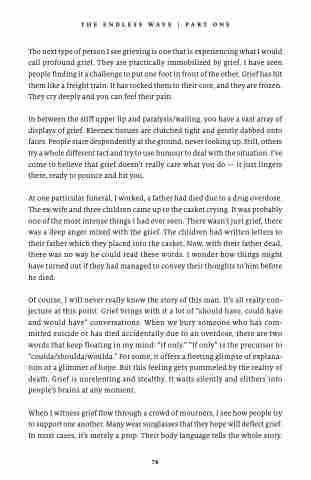 Of course, I will never really know the story of this man. It’s all really con- jecture at this point. Grief brings with it a lot of “should have, could have and would have” conversations. When we bury someone who has com- mitted suicide or has died accidentally due to an overdose, there are two words that keep floating in my mind: “if only.” “If only” is the precursor to “coulda/shoulda/woulda.” For some, it offers a fleeting glimpse of explana- tion or a glimmer of hope. But this feeling gets pummeled by the reality of death. Grief is unrelenting and stealthy. It waits silently and slithers into people’s brains at any moment.