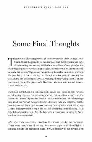 Earlier on in this book, I mentioned that 25 years ago I came up with the idea of calling my book on skateboarding’s history “The Endless Wave.” The pub- lisher and I eventually decided to call it “The Concrete Wave.” In some strange way, I feel like I’ve had the opportunity to have my cake and eat it too. But the last few years of the magazine were not easy. Getting writer’s block was truly a diabolical experience. It really did feel like something in me had died. I still loved skateboarding, but I felt I had come to a crossroads in trying to figure out how to move forward.