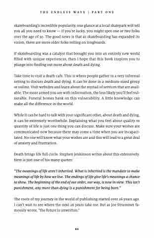 If skateboarding was a catalyst that brought you into an entirely new world filled with unique experiences, then I hope that this book inspires you to plunge into finding out more about death and dying.