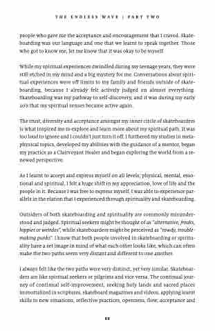 While my spiritual experiences dwindled during my teenage years, they were still etched in my mind and a big mystery for me. Conversations about spiri- tual experiences were off limits to my family and friends outside of skate- boarding, because I already felt actively judged on almost everything. Skateboarding was my pathway to self-discovery, and it was during my early 20’s that my spiritual senses became active again.