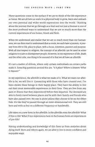 When we understand and realize that we are so much more than our human- ness, we can then start to understand that as souls, we each have a journey. A jour- ney from life to life, place to place, with a focus, intention, passion and purpose. With all due respect to religion, the concept of an afterlife can be used in some religions to scare or disempower people. However, in my experience of life, death and the other side, one thing to be assured of is that we all have an afterlife.